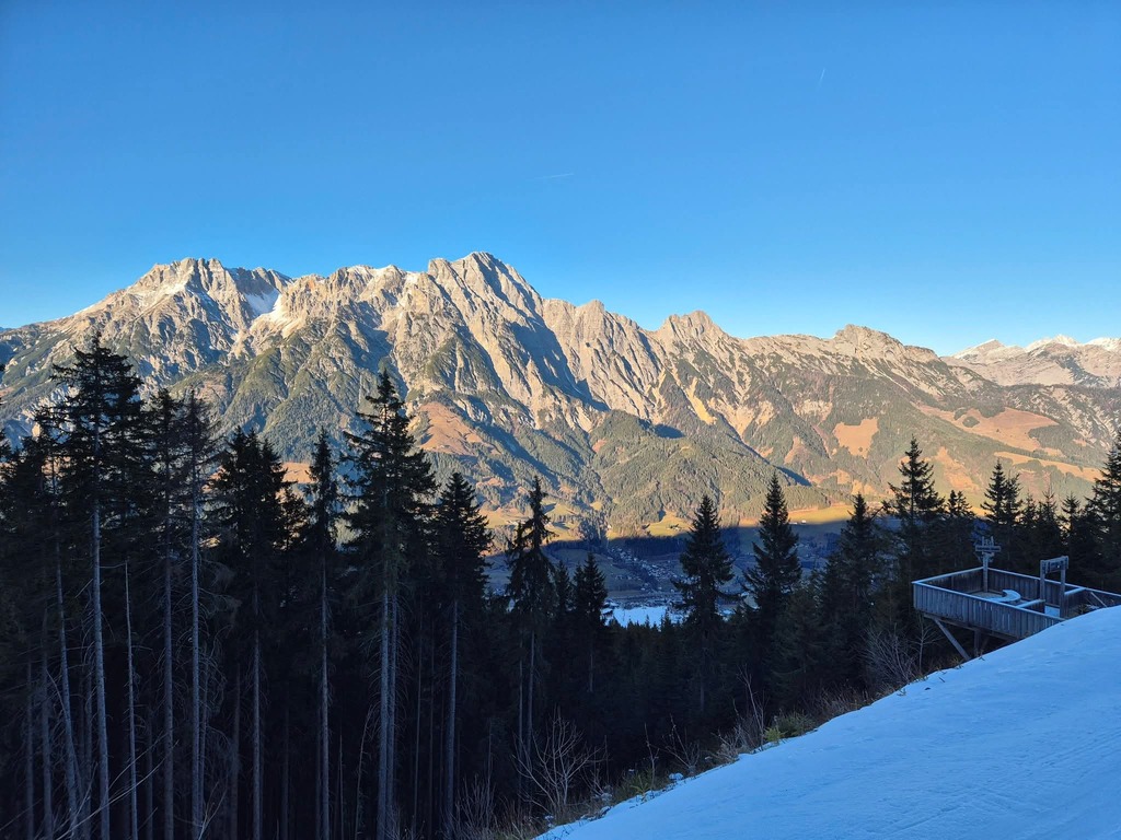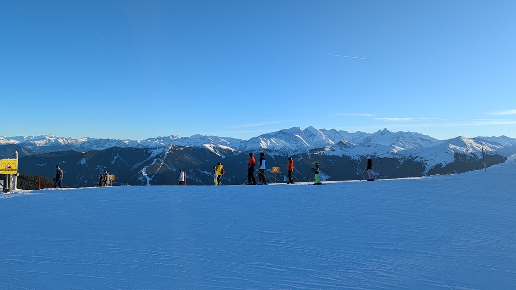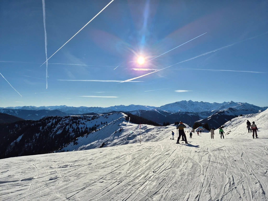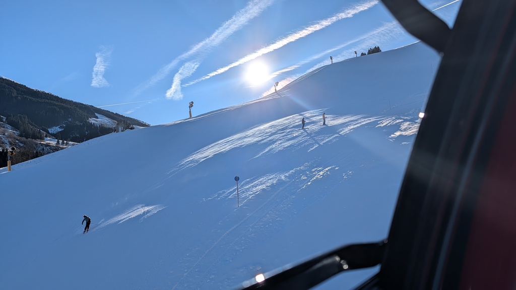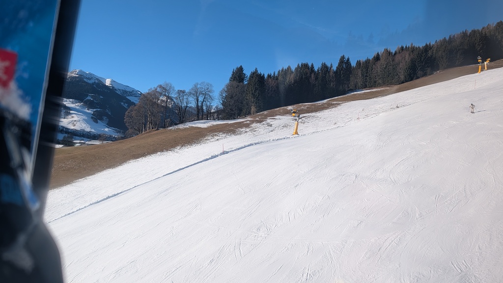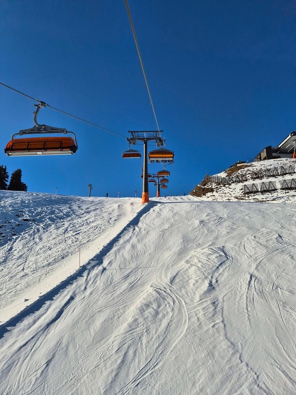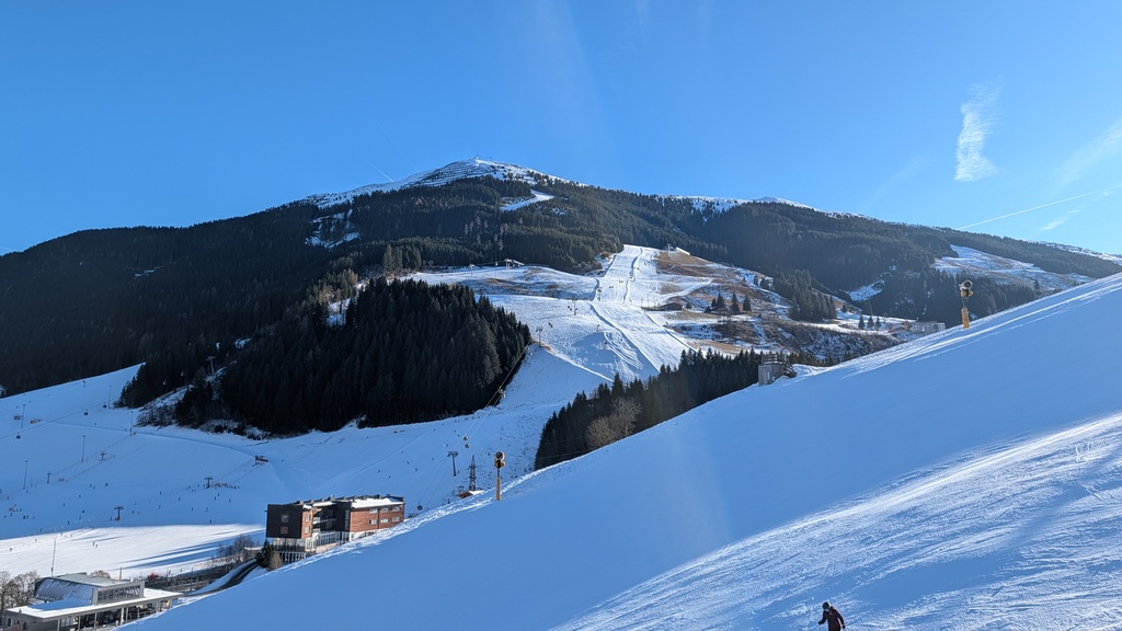 Die Schneelage neben den Pisten war vor allem auf der Südseite überschaubar bis nicht vorhanden, und es waren auch lange nicht alle Pisten offen, aber die geöffneten Pisten waren in gutem bis sehr gutem Zustand, und man konnte das Skigebiet in beiden Richtungen umrunden.