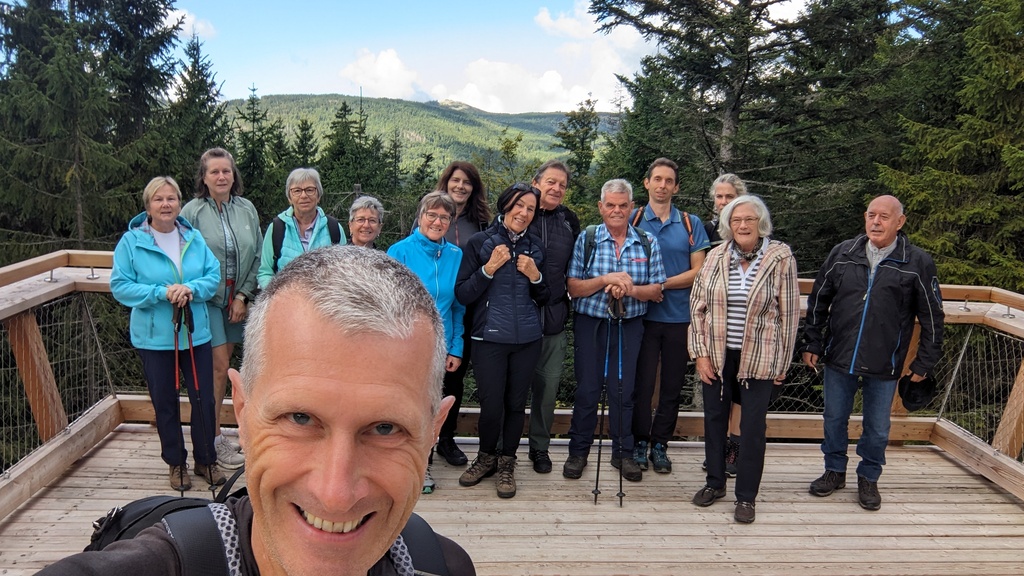 Vom Parkplatz am Nationalparkcafé Wistlberg starteten wir unsere Tour, die uns zunächst auf die neue Aussichtsplattform mit ihrem beeindruckenden Blick auf den Lusen führte. Weiter ging es über wunderschöne Wege zur Reschbachklause. Hier trennten sich unsere Wege vorübergehend. Eine Gruppe ging den Weg über den Siebensteinkopf, einen immerhin 1.263 m hohen Berg. Die andere Gruppe umwanderte den Berg. Am Grenzübergang Bučina trafen wir uns wieder.